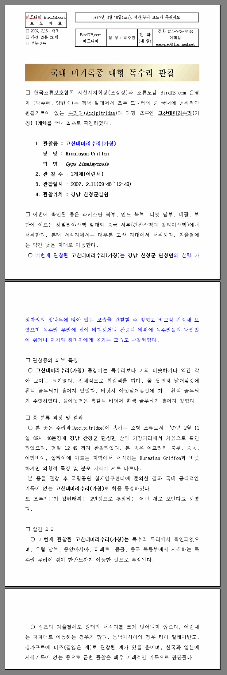 동시관찰자 3명 (조정장,양현숙,박주현) / 검색사이트 검색어 "고산대머리수리"