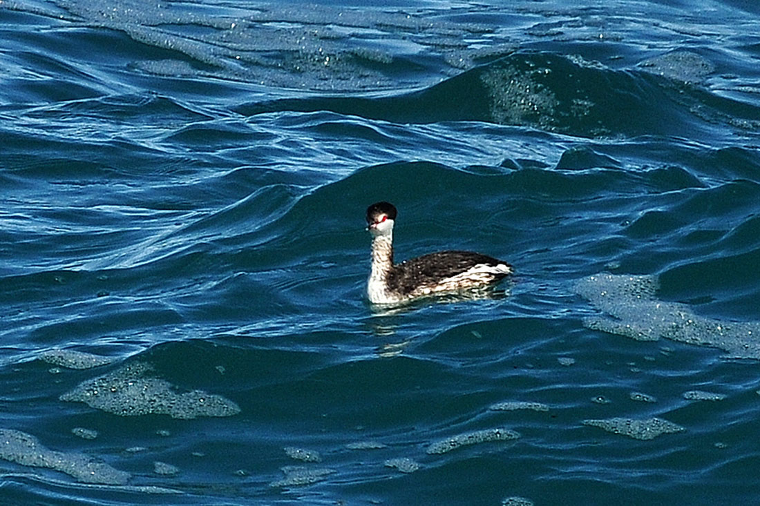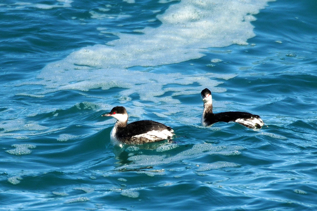 동해의 푸른 물과 귀뿔논병아리의 빨간 눈이 인상적입니다.
