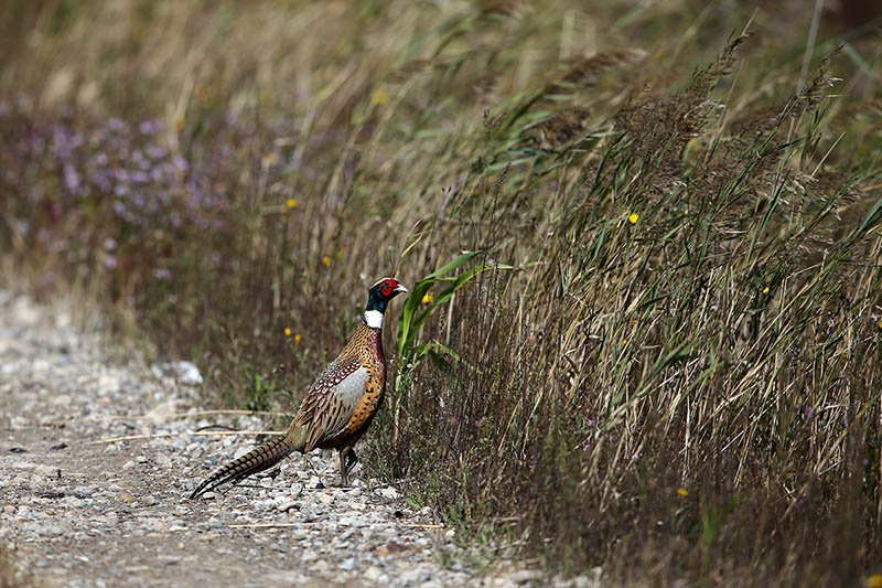 뒤에 아웃 포커싱된 쑥부쟁이 색깔과 꿩의 색깔이 너무 조화롭습니다.