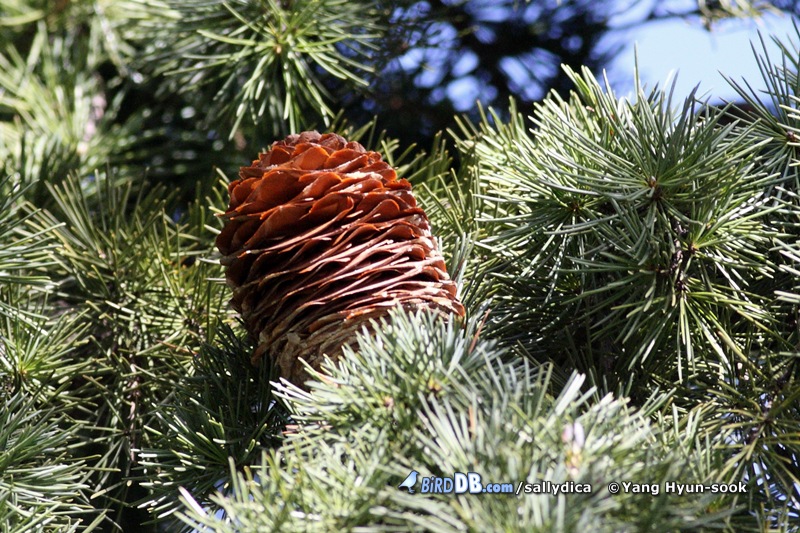 노랑배진박새가 개잎갈나무(?)로 보이는 열매를 먹습니다.