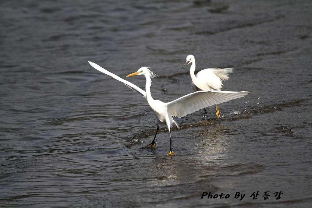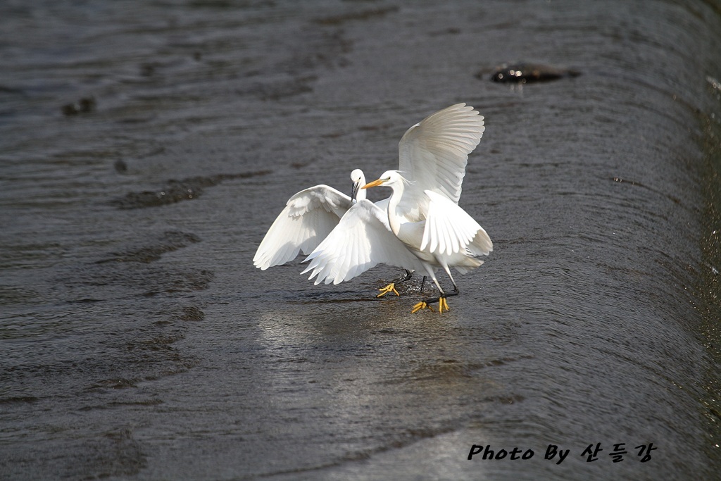 쇠백로와 다투고 있는 노랑부리백로...
