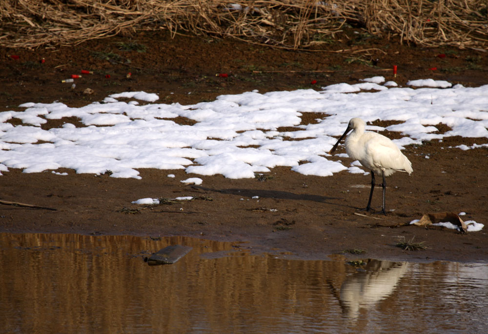 널부러진 탄피를 바라보는 노랑부리저어새의 눈길이 근심스러워 보입니다.