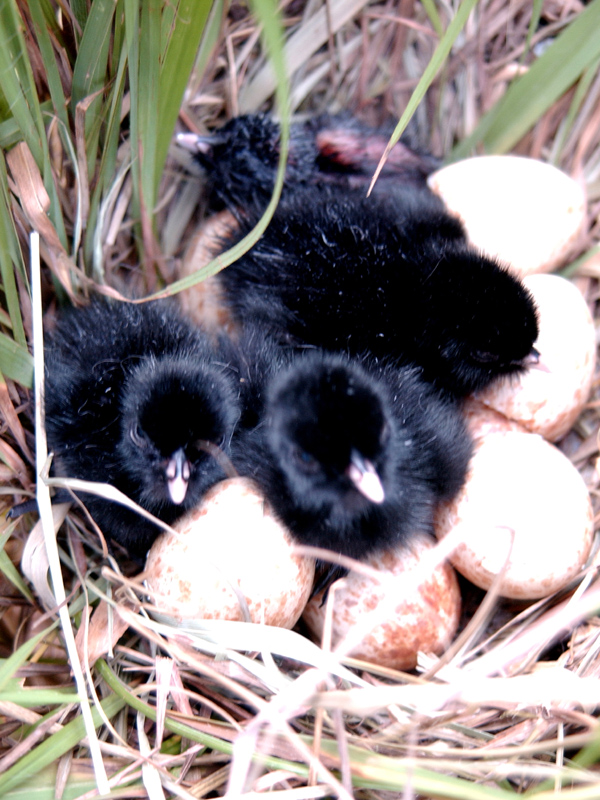 새끼 보니까 기억이 나는데 어릴때 저 새끼를 잡아다 집에서 키워 본다고... 지금 막 부화되고 있는 거 같습니다. 지금은 새끼들이 검은색 깃털로 덮여있지만 자라면서 불에 그을린 듯한 붉은색 깃털로 모습이 바꿘답니다.