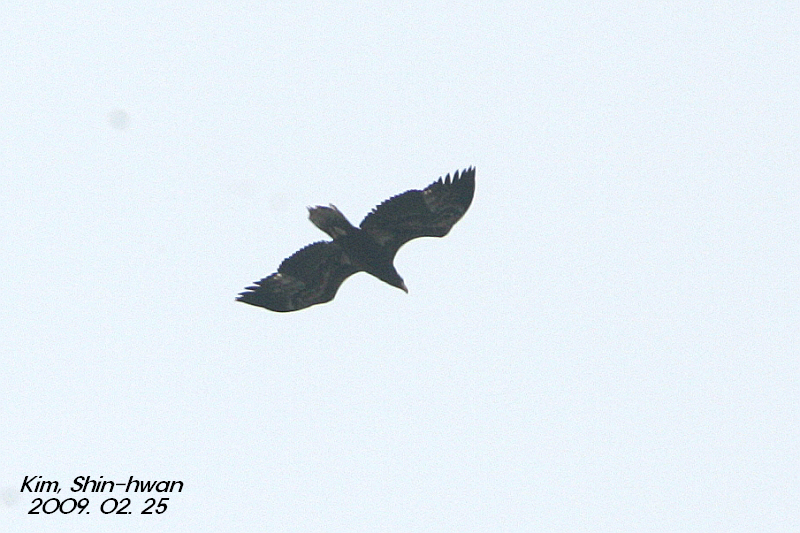 흰꼬리수리 어린새 아닐까요. 일본 다큐를 본 적이 있는데 어린새는 꼬리색이 거진 까무스럼 하더라구요^^