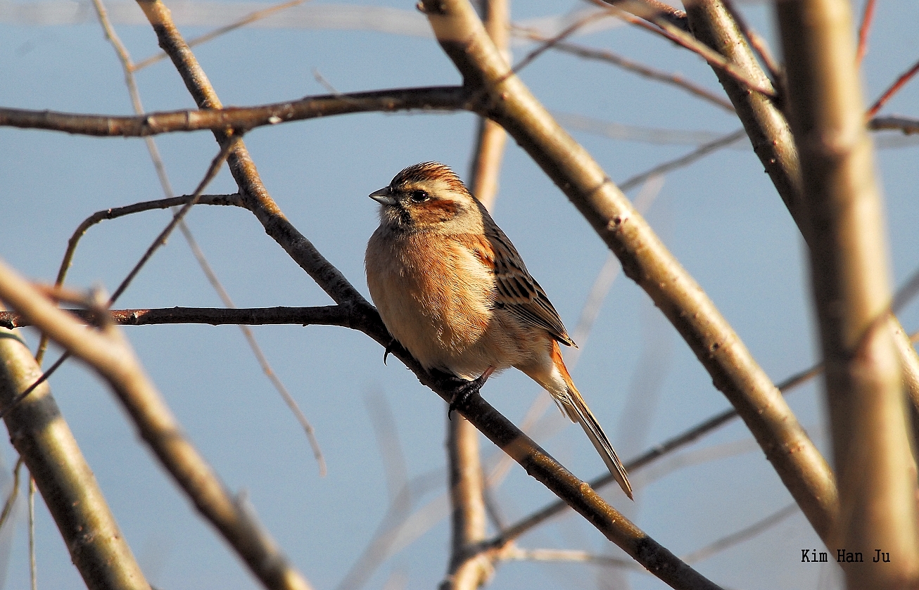 전체적으로 색이 엷은데요..흰눈썹과 갈색볼 갈색배, 회색빛 목덜미 등으로 보아 멧새 암놈으로 생각됩니다.