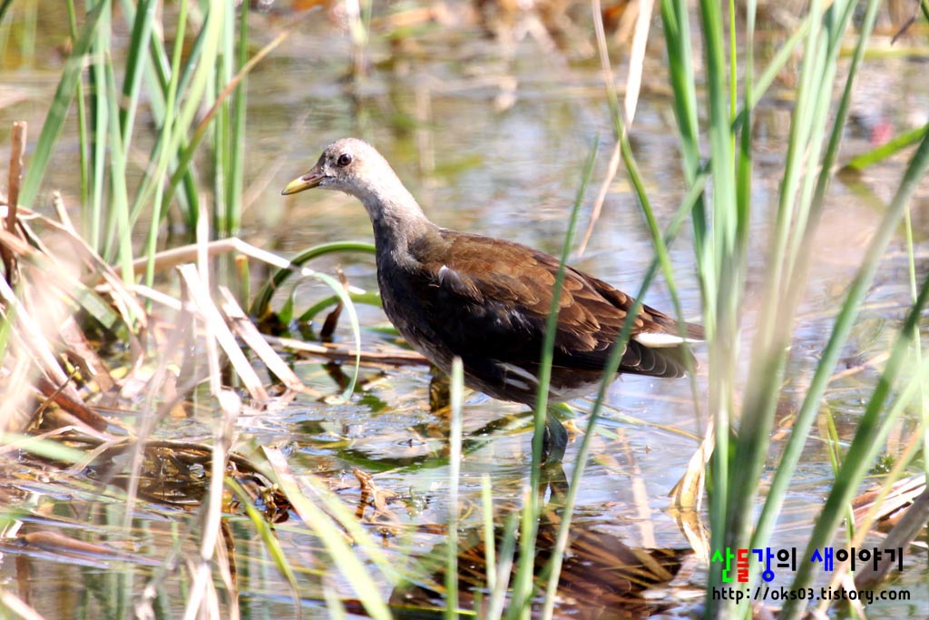 꼬리부분에 흰점이 보이는 것으로 보아 같은 뜸부기과의 쇠물닭 어린 새라고 생각이 되네요