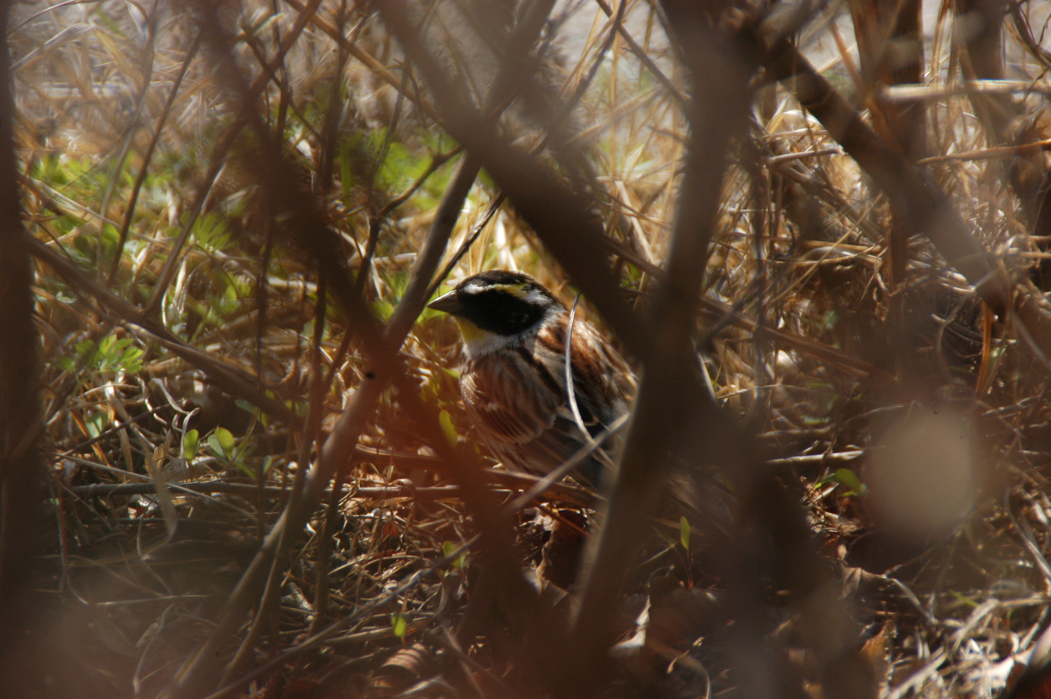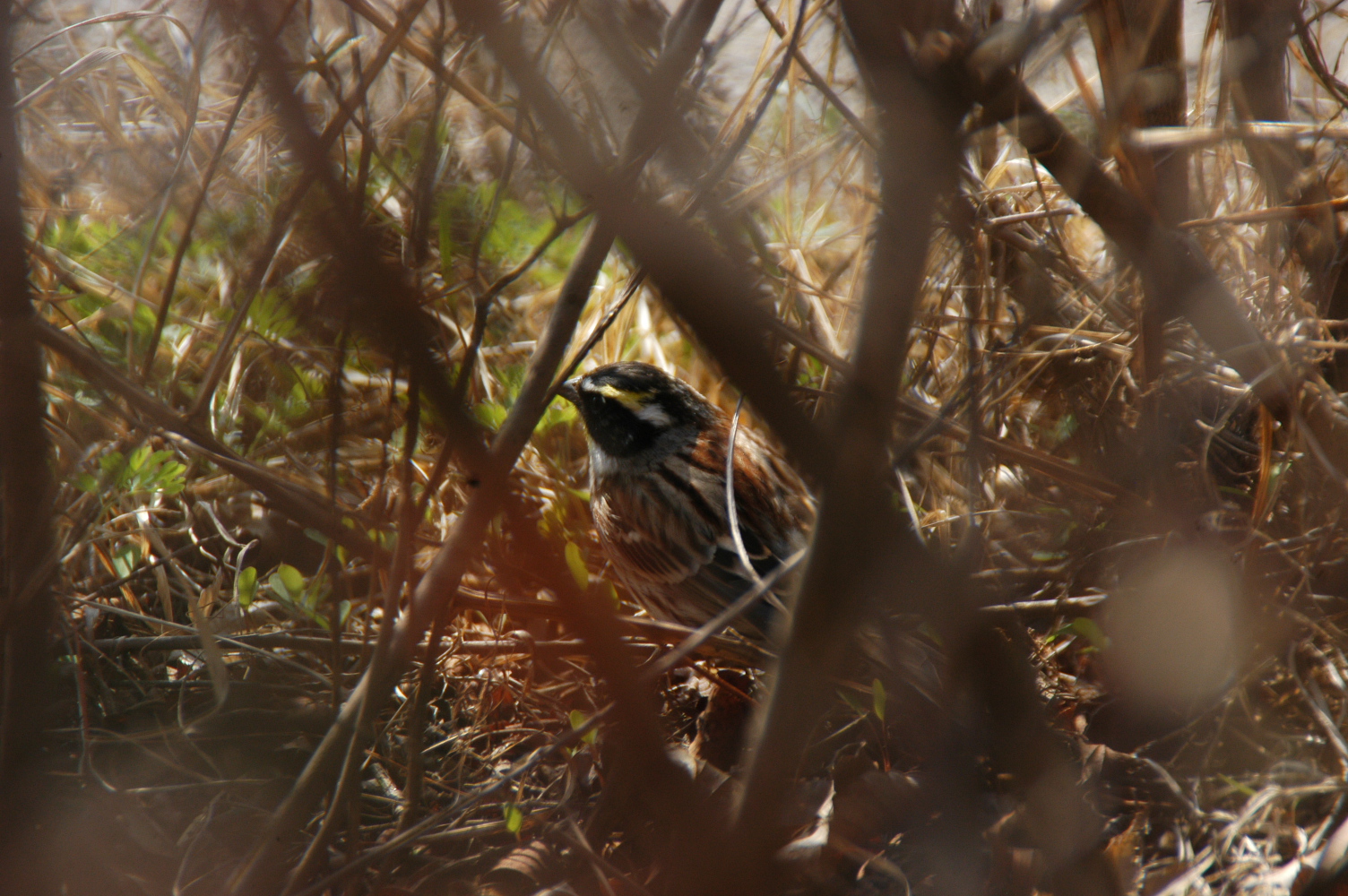 제 소견으로는 가슴부위의 검은 삼각형은 자세상 명확히 보이진 않지만, 일단 두번째 사진으로 볼때 턱부분이 선명한 노란색이고 귀깃에 흰점이 없는 것으로 봐서 노랑턱멧새인듯 합니다. 도감 찾아보니 노랑눈썹멧새는 턱부분의 노란색이 없고, 귀깃에 흰점이 있는게 동정포인트라고 되어있네요..^^