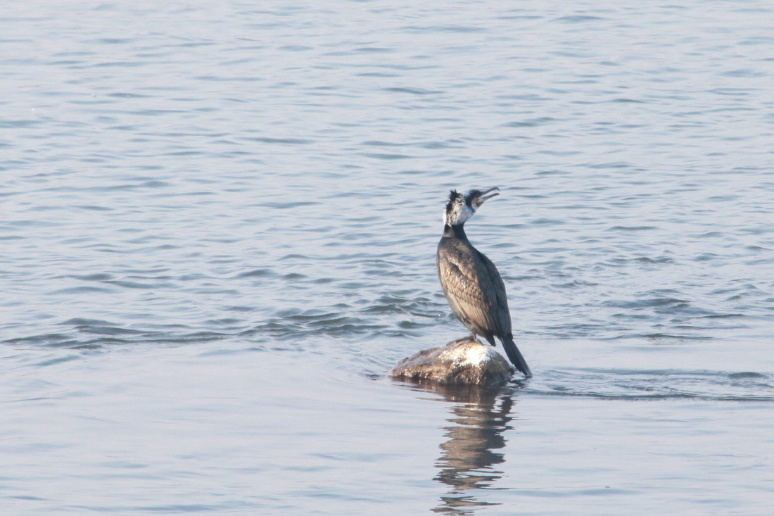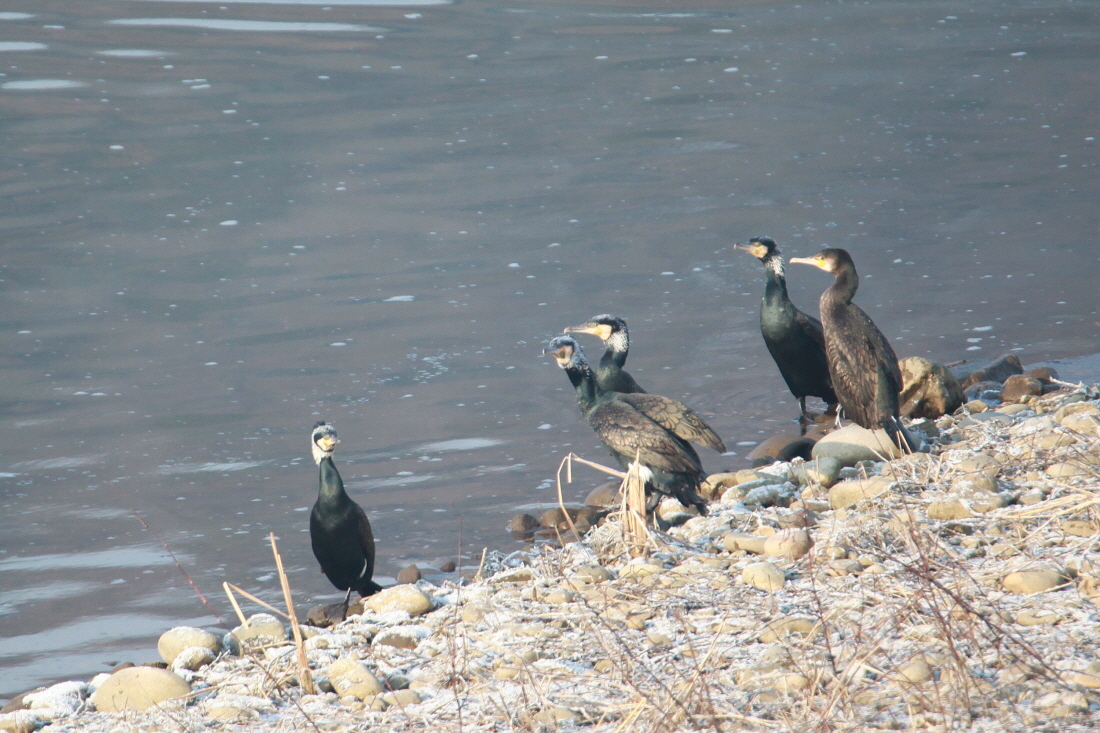 민물가우지의 무리와 같이 있는 등이 갈색이고 배부분이 흰색인 이 모습이 같은 민물가마우지 인지요?