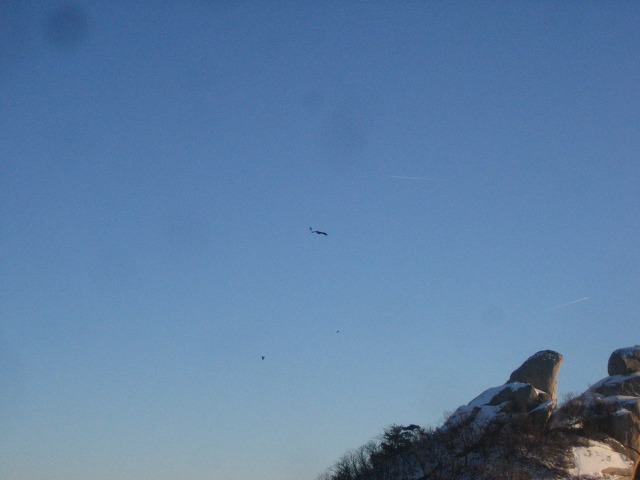 사진이 너무 작습니다.. 자르기 확대 하셔서 다시 올려보세요~ 옆에 개체가 까마귀라면 적어도 흰꼬리수리 이상 크기의 맹금류 같습니다