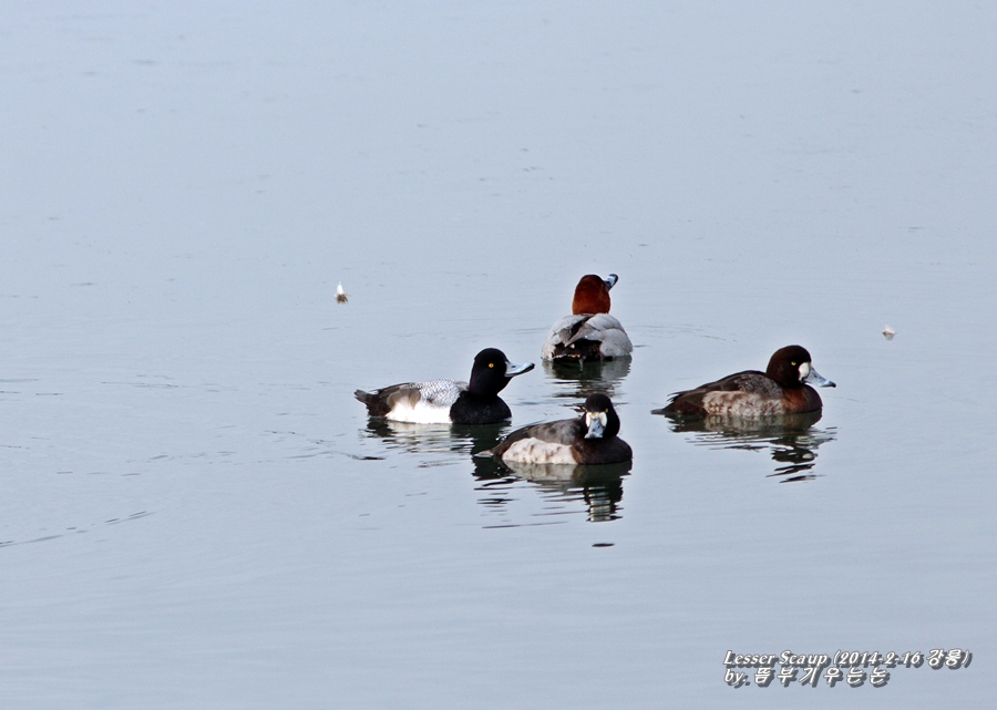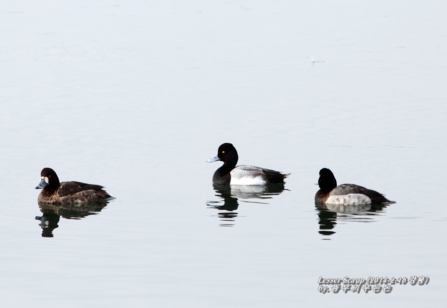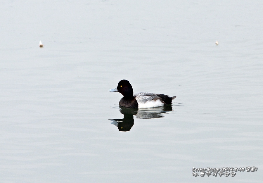 현장에서는 검은머리흰죽지보다 크기가 조금 작고 ,뒤통수에 작은 혹처럼 깃털같은게 삐죽 나와있는 것이 하나의 식별 포인트였습니다.