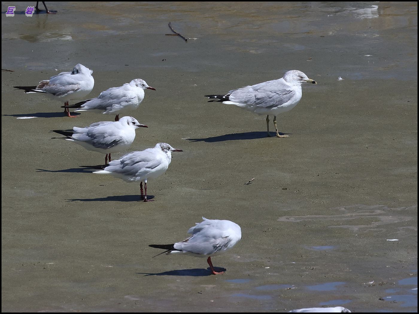 붉은부리갈매기 삼백여 마리 무리와 같이 있습니다