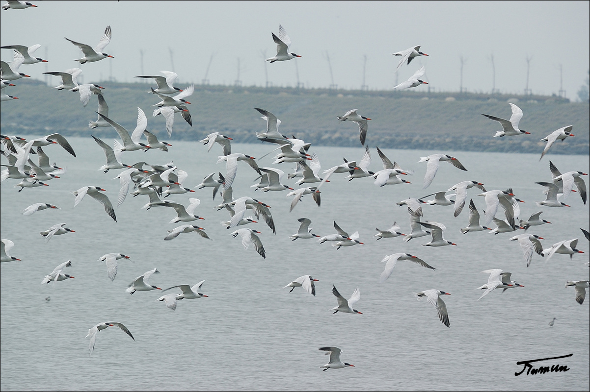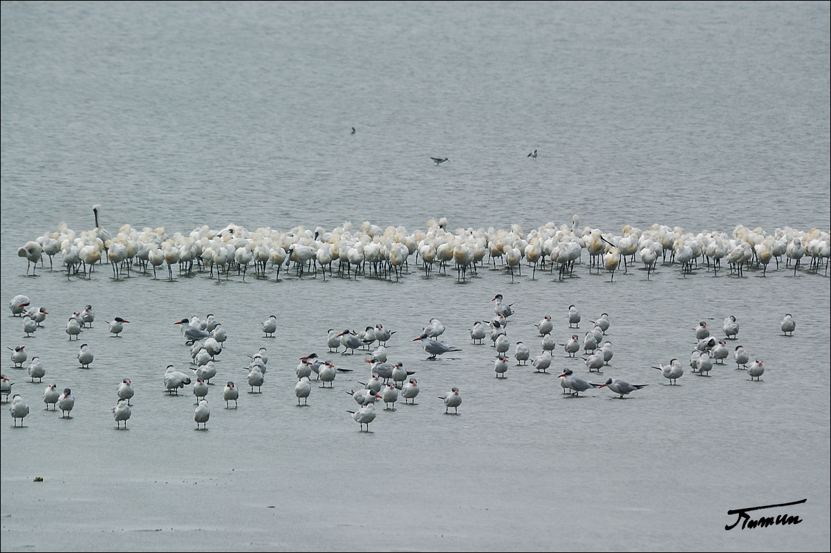 저어새 무리와 함께 겨울을 지내던 붉은부리큰제비갈매기 무리입니다.