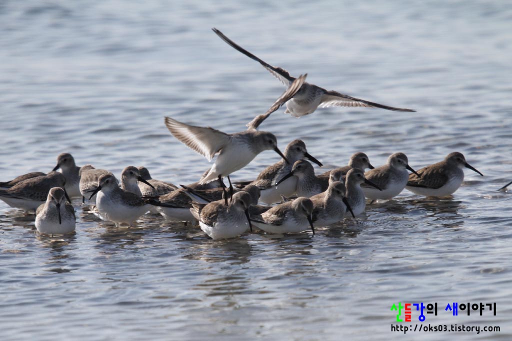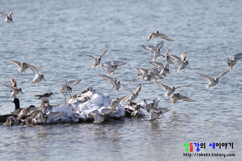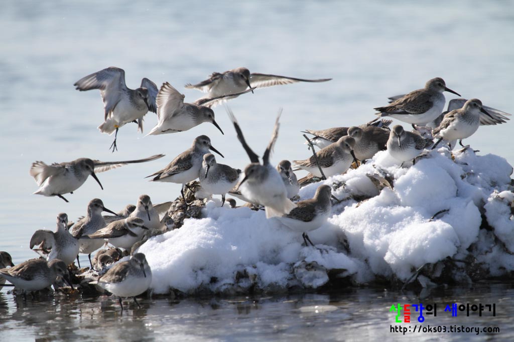 민물도요 맞네요. 아직도 덮힌 눈위로 쉬기위해 모여드는 도요들이네요.