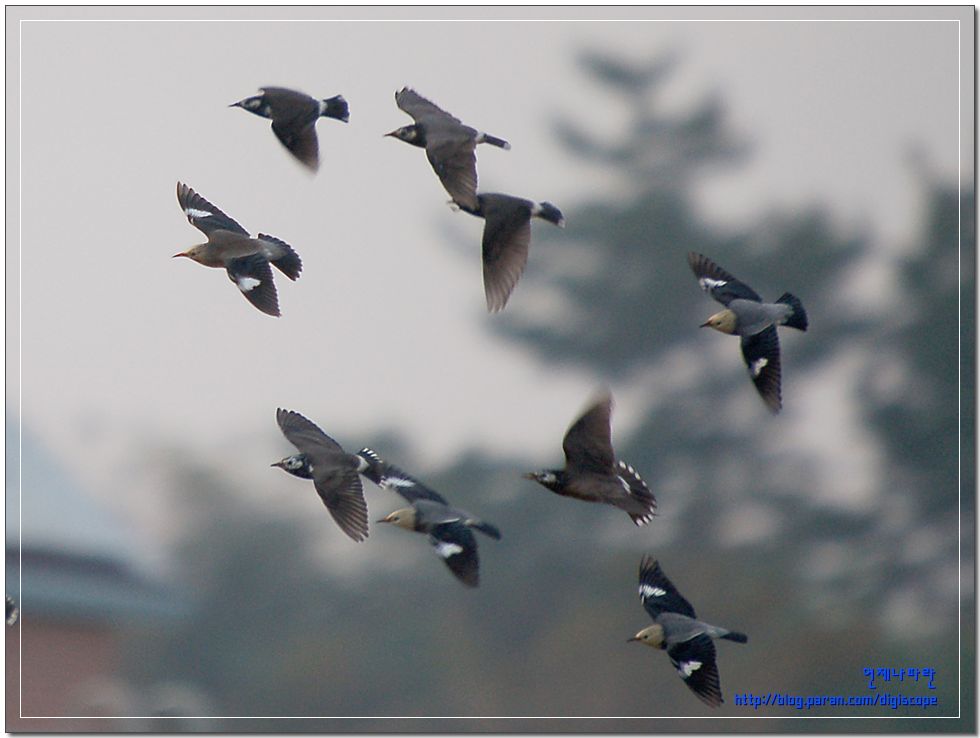 저 많은 찌르레기들 속에 붉은부리가 섞여있다는 말이지요. 의왕에도 한마리만 보내주세용