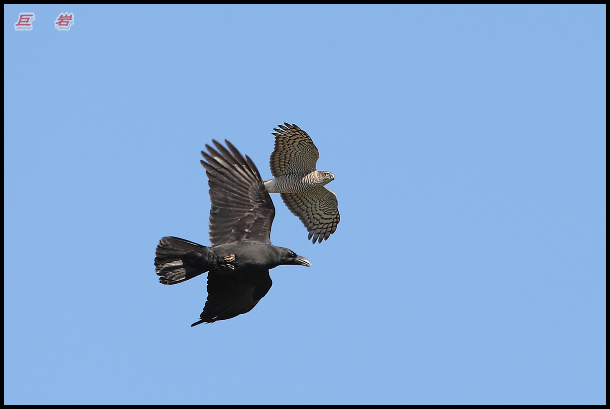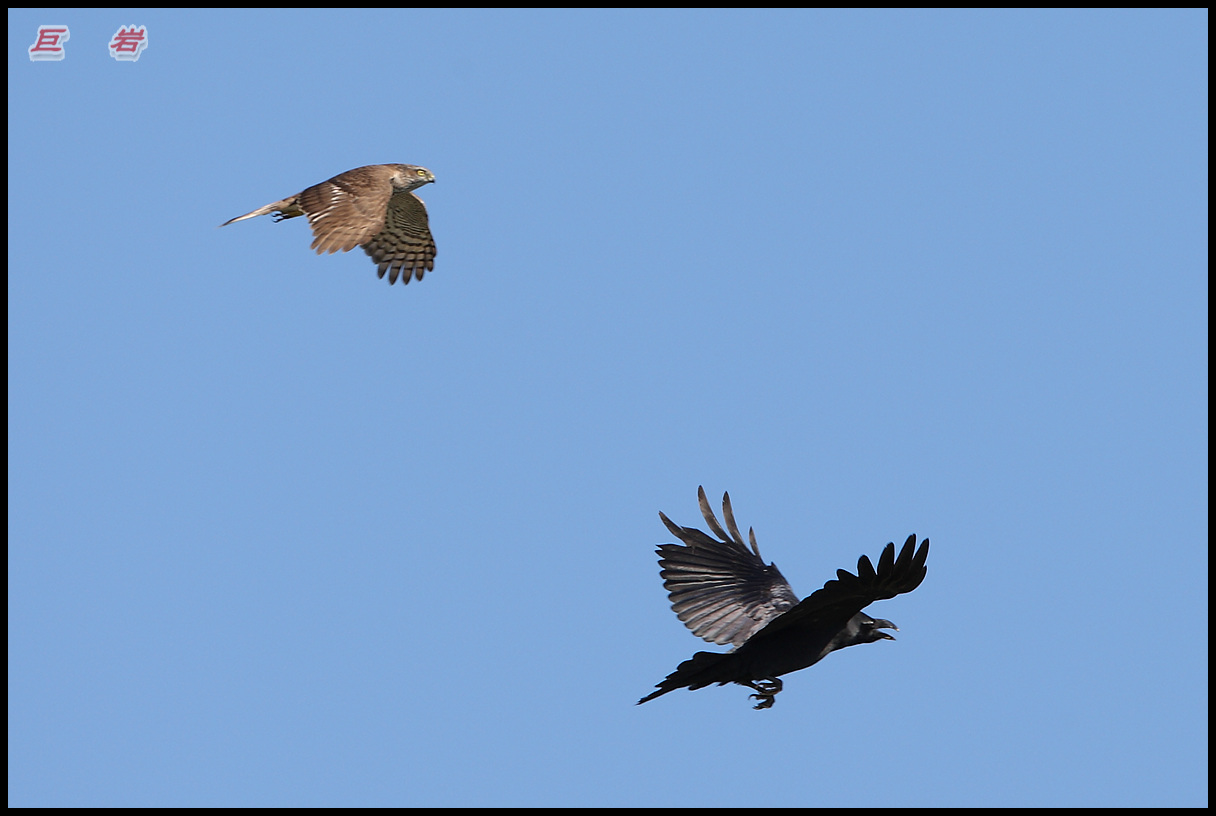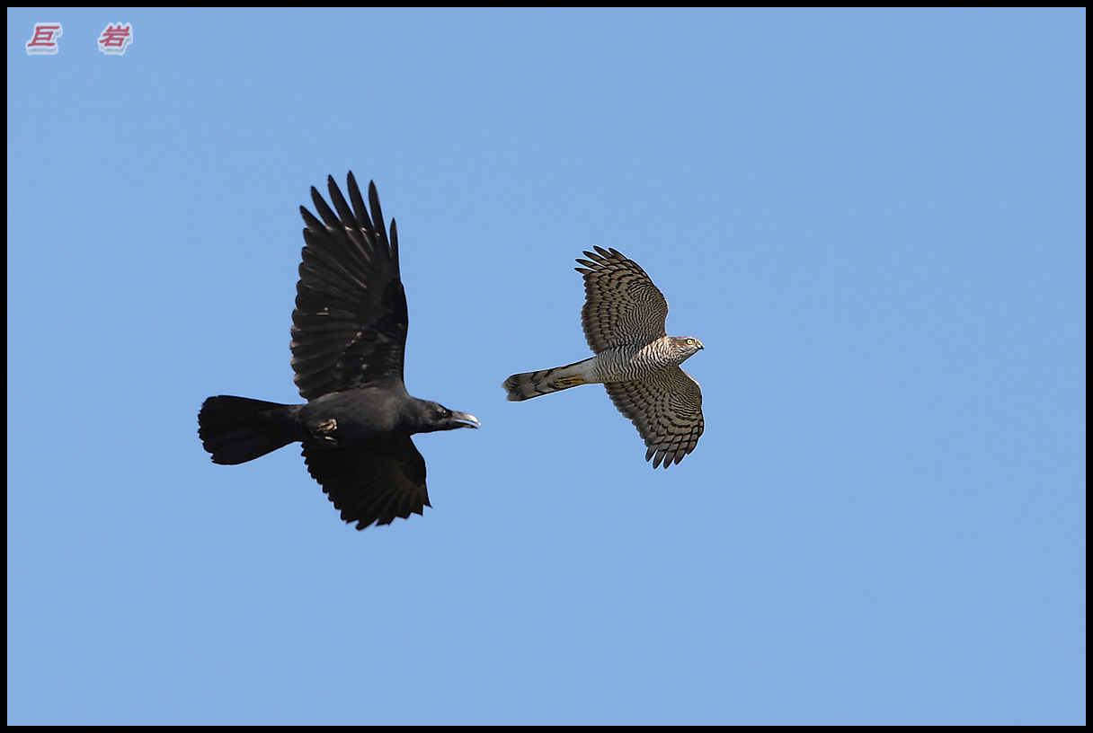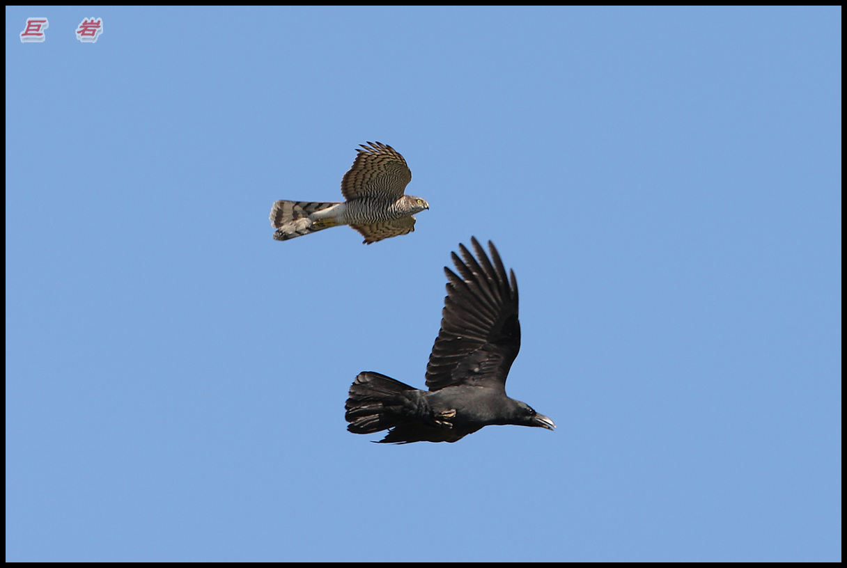 소나무 숲속에 은신하고 있다가 귀찮게 달라붙는 큰부리까마귀를 응징하는