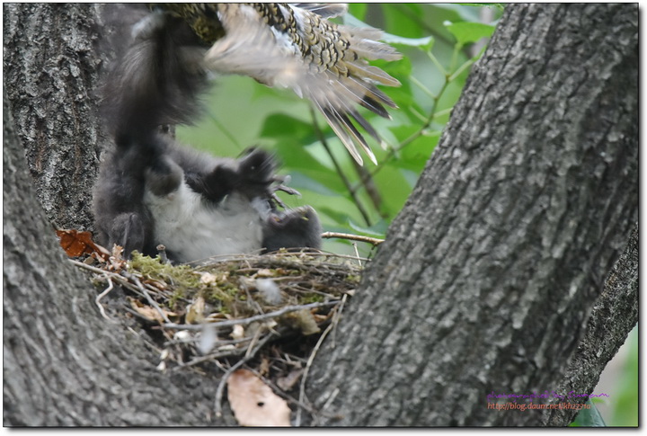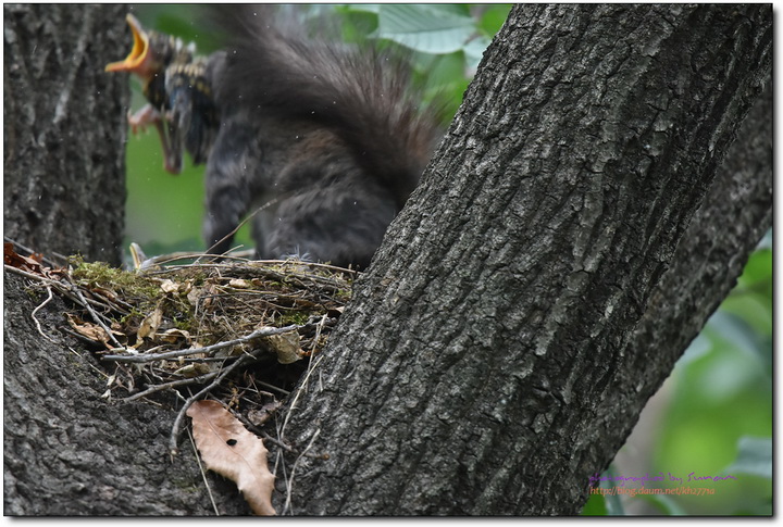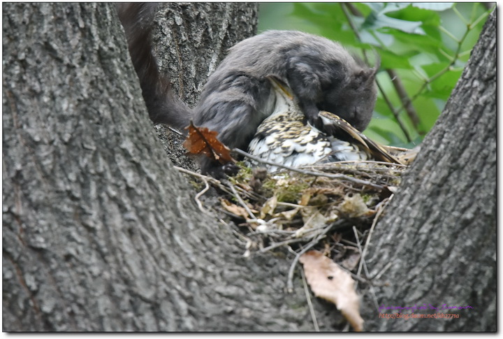 간이위장막을 설치하고 호랑지빠귀 육추과정을 보고있던 중 청설모가 호랑지빠귀의 어미가 지키고있음에도