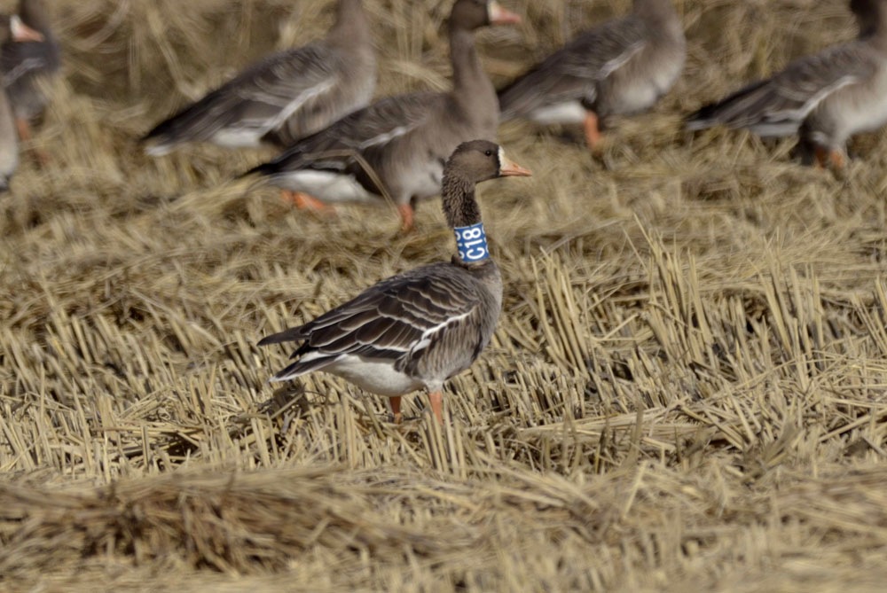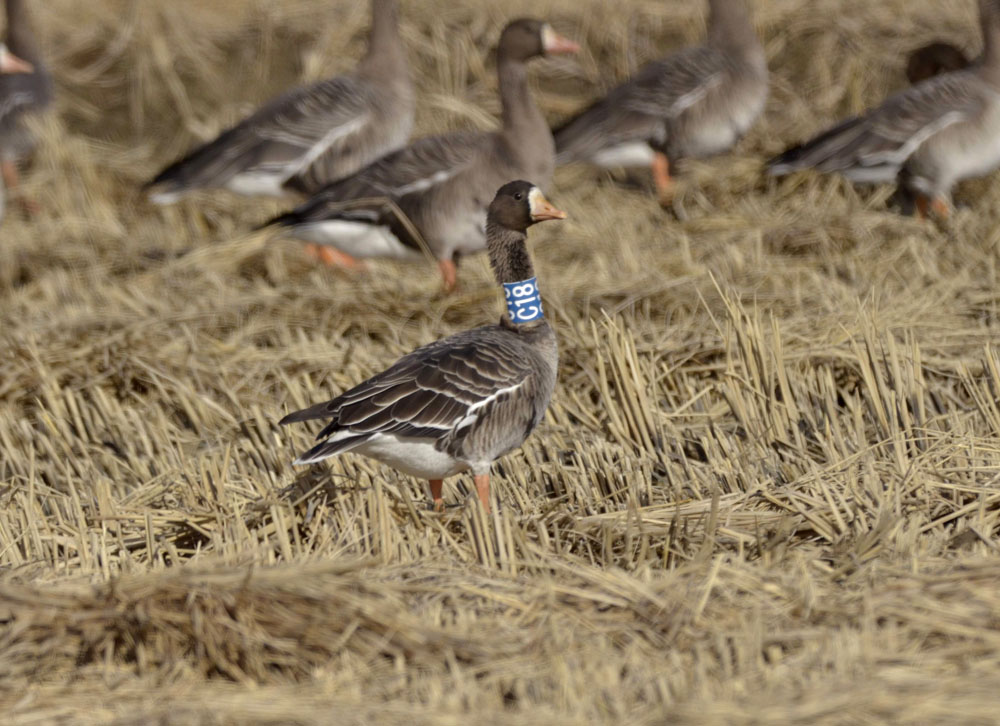 2005년 4월 7일 일본 북해도 서부의 비바이 시(北海道 美唄市)에 위치한 람사르 습지인 미야지마누마(宮島沼) 호수에서 포획되었던 암컷 성조라 하고, 다음해부터 관찰되지 않는다고 하네요.