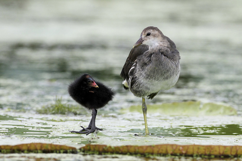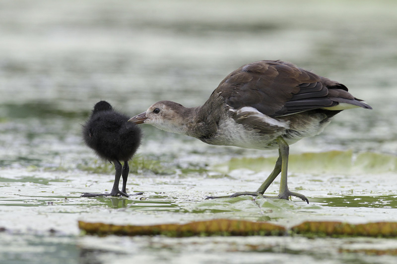 6월에 태어난 새끼가 어린 쇠물닭을 데리고 다니기도 하고 먹이도 주며 깃털도 골라 줍니다.