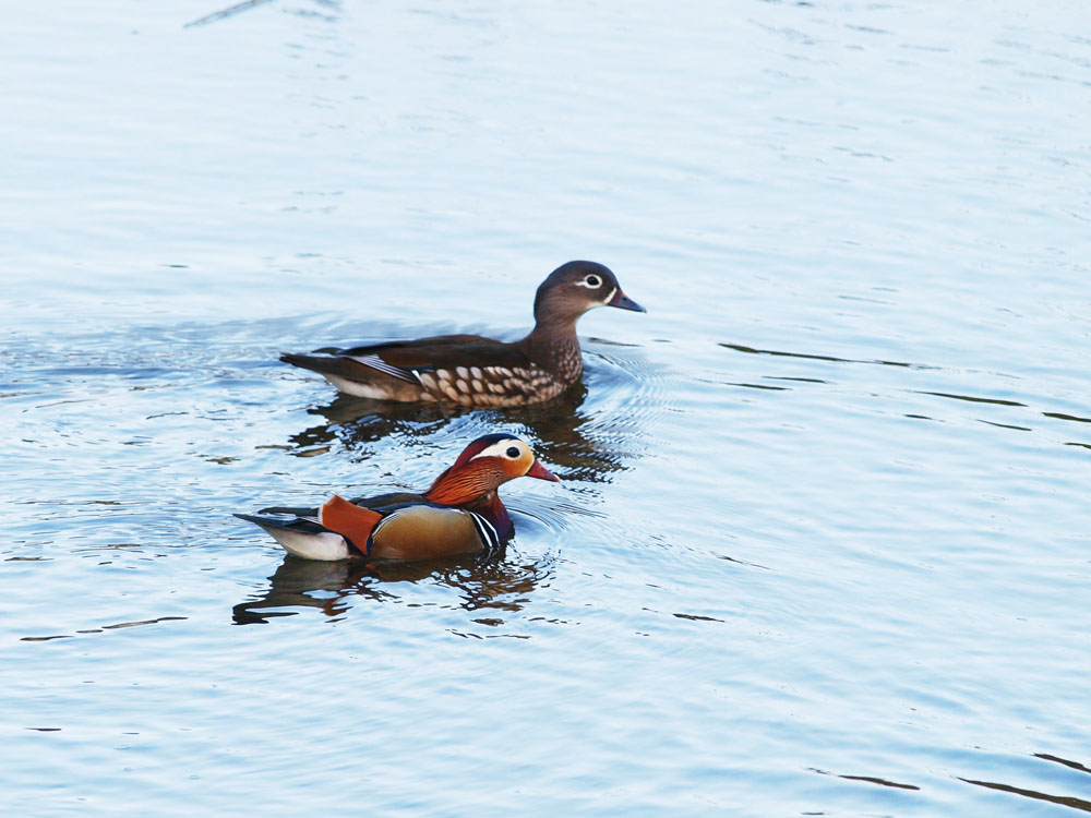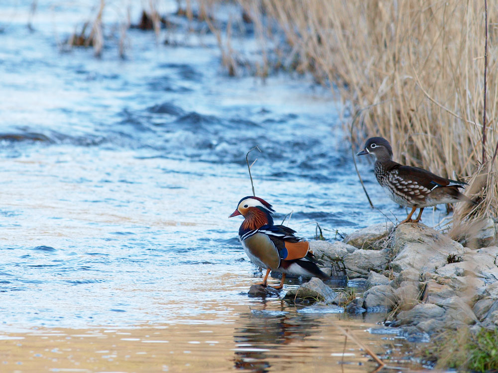 두마리만 있는 것으로 보아 원앙 텃새로 생각되네요. 예쁩니다.