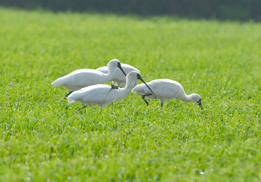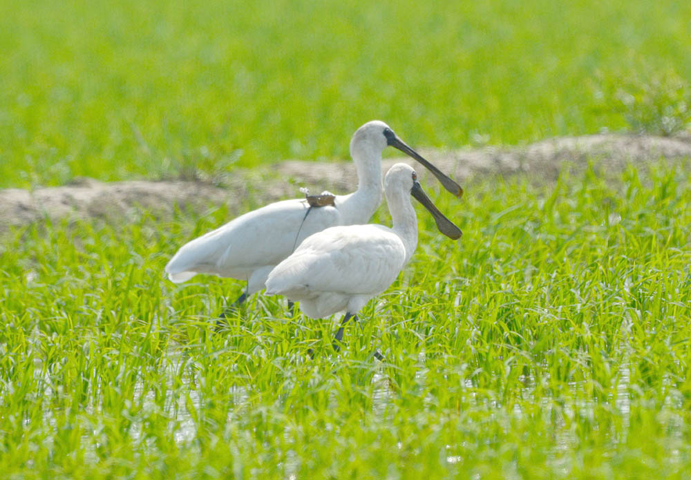 위성추적장치가 부착된 저어새이네요. 추적장치는 3년 정도되면 수명을 다하며 이때쯤 끈이 닳아서 떨어지게 된답니다. 가락지가 없어 누가 부착했는지 알수가 없네요. 한국, 대만, 홍콩, 일본 등지에서는 반드시 유색가락지도 같이 달기 때문에 다른 곳에서 단 듯합니다(중국???). 곧 떨어질 듯 합니다. 감사.