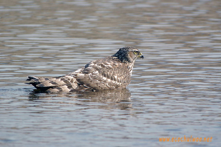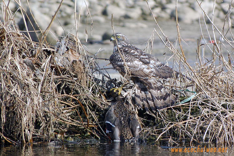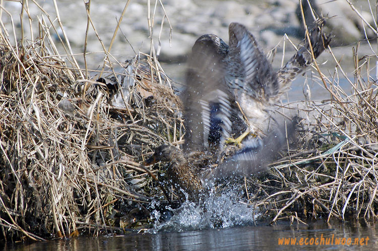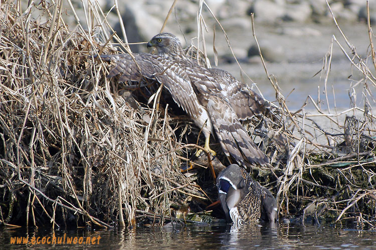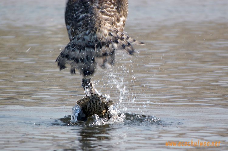 오리의 머리를 붙잡은 채 두 날개를 퍼덕거리며 헤엄을 쳐 하천의 갈대밭에 겨우 도착.