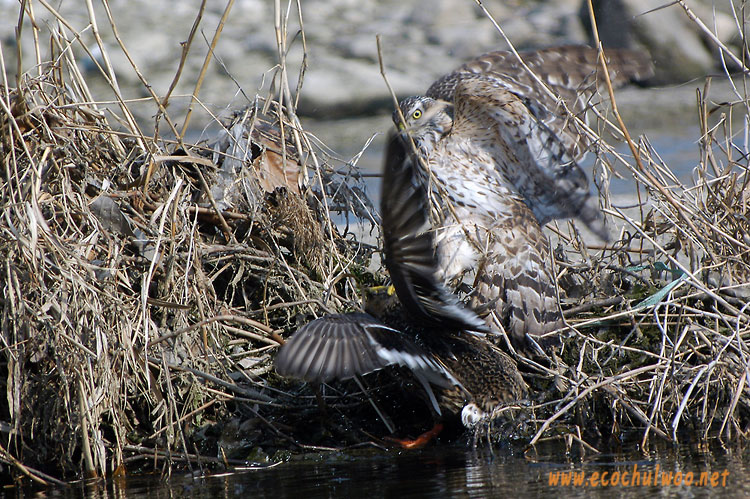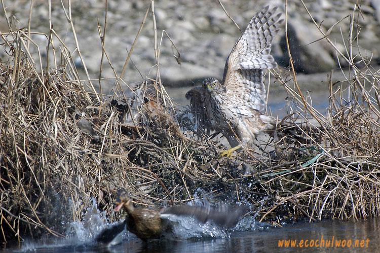 '걸음아 나 살려라' 냅따 줄행랑을 치는 청둥오리 암컷과 약간은 당황스런 참매의 표정