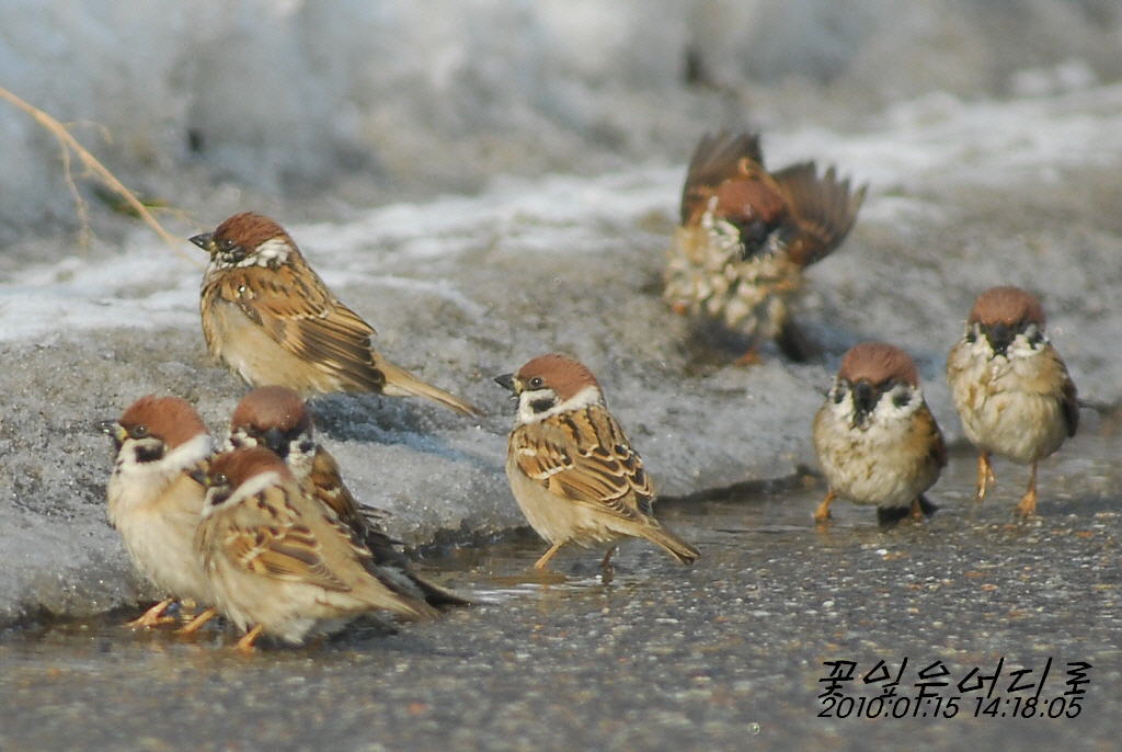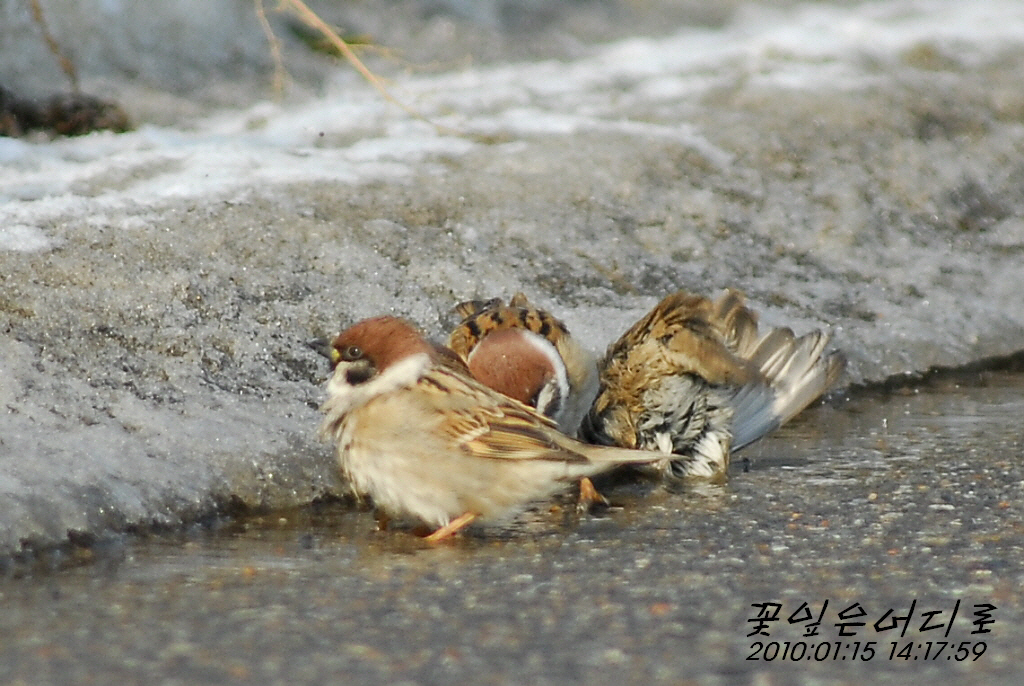 깔끔을 떠는 참새들이네요.