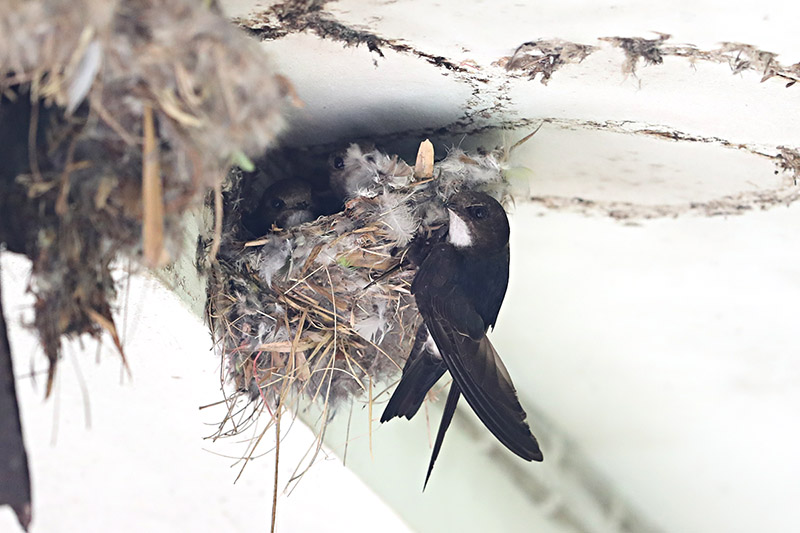 바위 틈에 집을 짓는다 했는데 이 새들은 건물 처마 밑에 둥지를 틍었습니다.