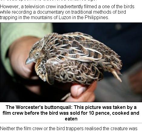 필리핀에서만 서식하는 것으로 알려진 우스터 세가락메추라기류(The Worcester buttonquail)라는 새는 수십 년간 자취를 감춰 조류학계에서는 잠재적 '멸종 새'로 알려져 있었다