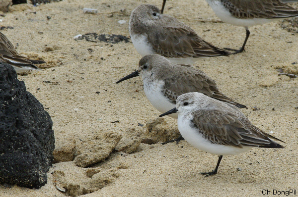 세가락도요와 민물도요 : 만조가 되자 해안가에 쉬고 있는