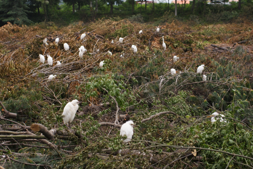 위> 베어진 나무들과 그 위에 앉아 있는 백로들