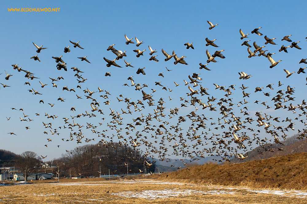 흰뺨검둥오리의 군무