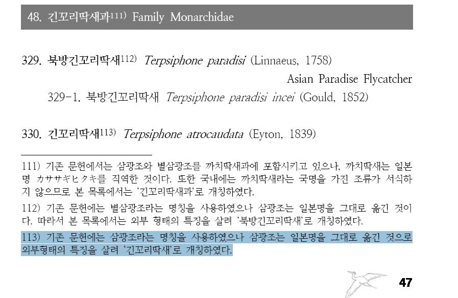 또한 별삼광조라 불리던 새도 북방긴꼬리딱새로 개명되었군요