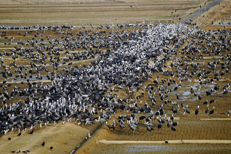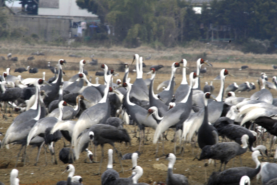 이즈미 흑두루미 집단 먹이 먹는모습