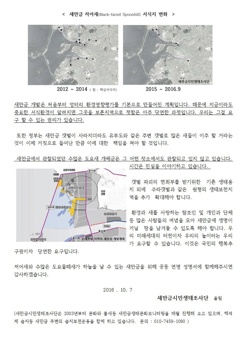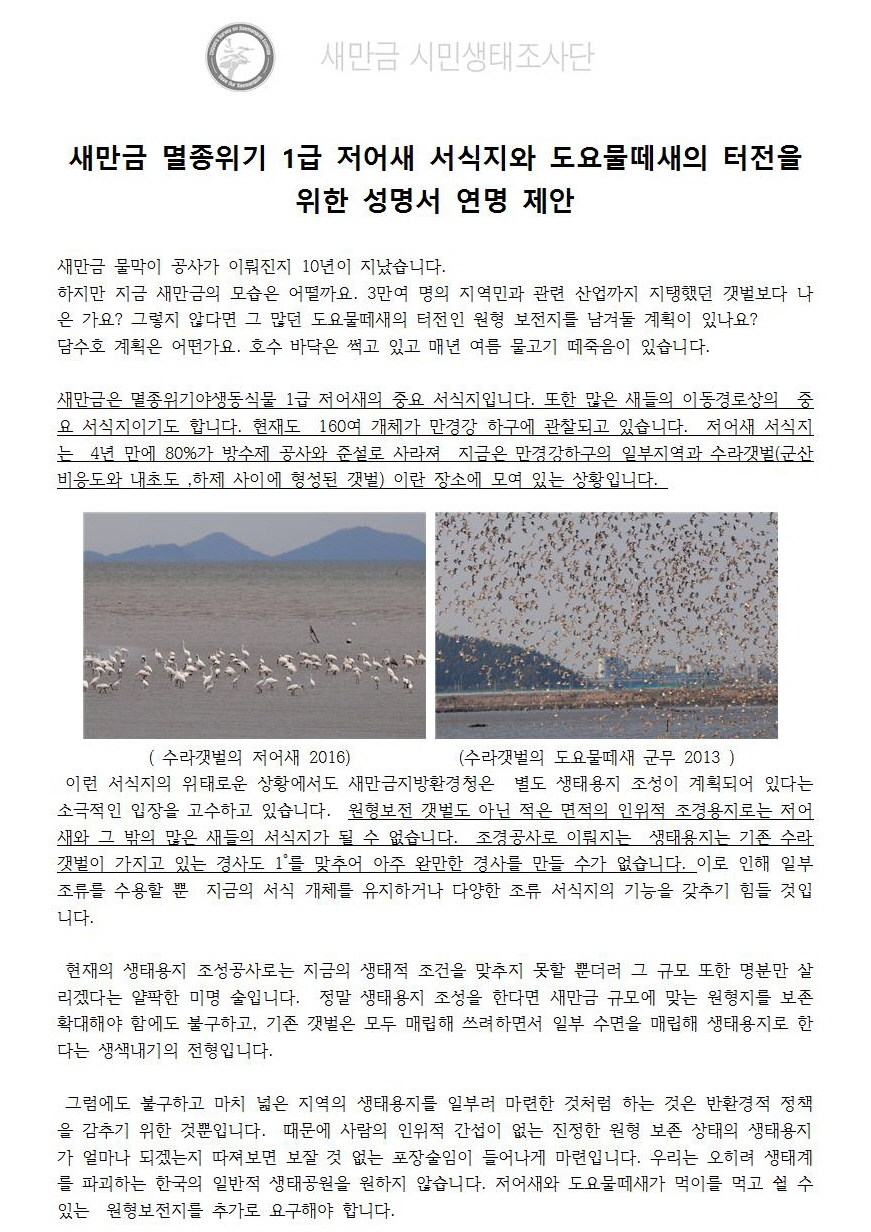 이에 저희 새만금시민생태조사단에서는 저어새와 도요물떼새의 서식지 보전을 위한 원형보전지를 확대하라는 성명서 연명 단체를 모집하고 있습니다.
