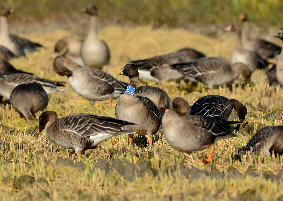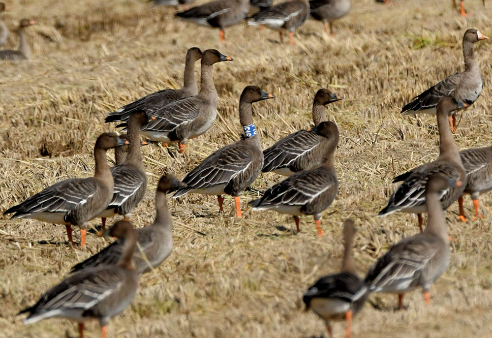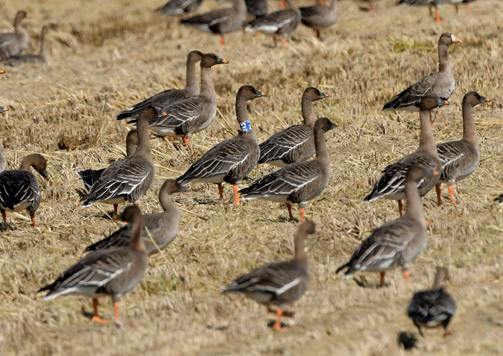 기러기를 관찰하던 중 목에 인식표가 있어 사진을 찍고 보니 과거에는 찍었다는 생각이 들어 사진을 찾아 보니 2018년 10월 13일에 역시 서산에서 만난 개체이다.