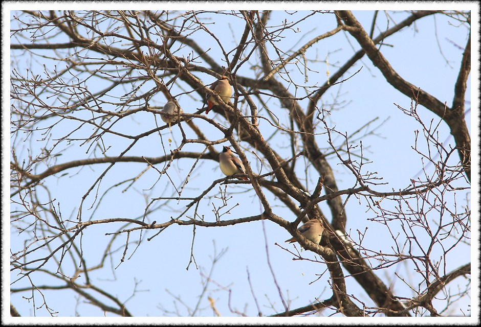 육림호? 작은 연못바로 아래쪽 나무 꼭대기에 홍여새 7마리가 보입니다