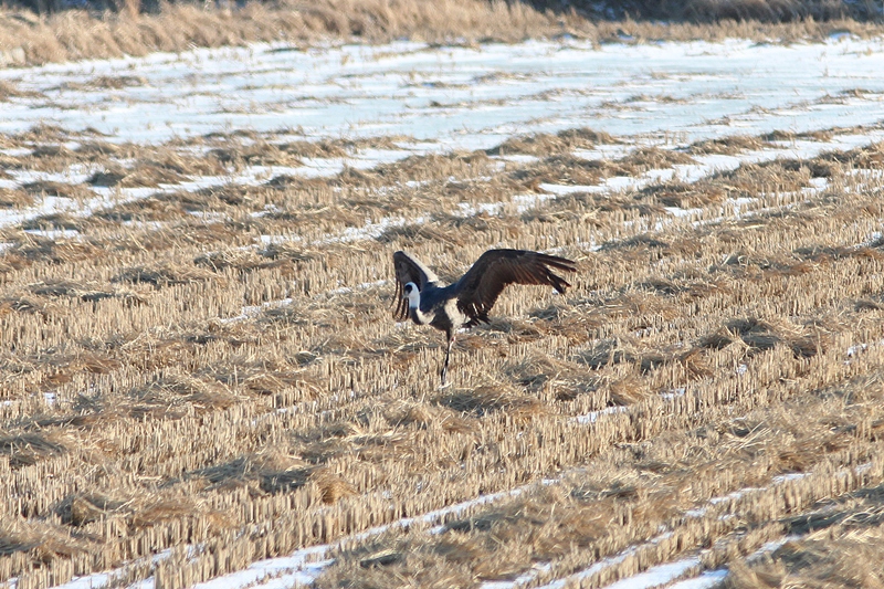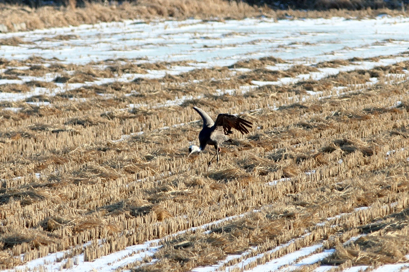 다리를 다쳐서 무리에서 떨어져 홀로 있던 흑두루미...