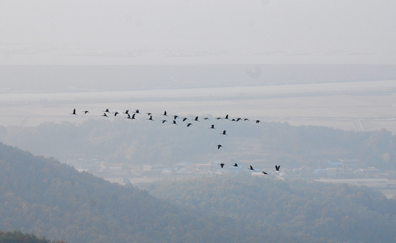 다른 내륙의 경로로 흑두루미들이 내려갈 지도 모르지만 일단 서해안 선을 타고 내려가는 흑두루미들은 남한의 최북단인 강화의 여러 산에서 관찰이 가능합니다.
