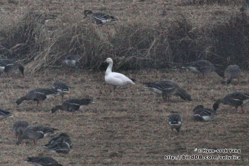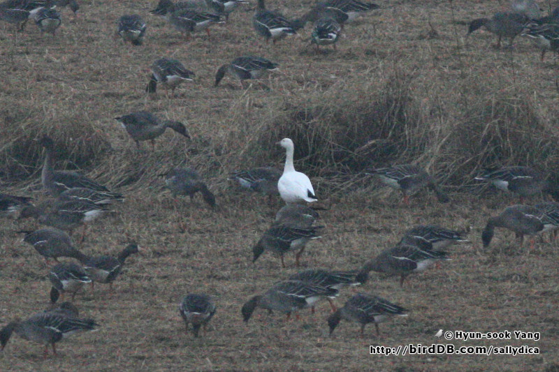 오후5시가 넘은시간... 어둑한 논가운데.. 수많은 기러기들속에 하얀 녀석이 둘 보이더군요. 쌍안경으로 보니 반갑게도 흰기러기였습니다. ^^