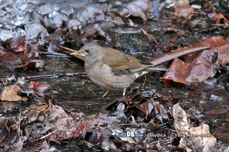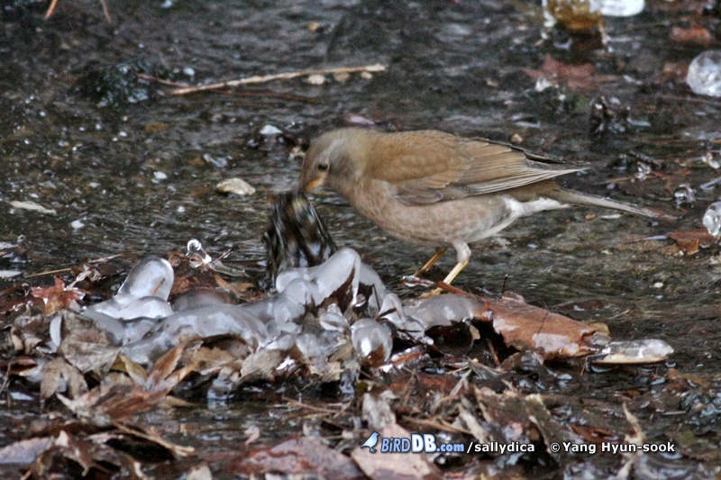어둑한 수로에서 낙엽을 열심히 뒤적거리는 흰배지빠귀 한 녀석을 만났습니다.
