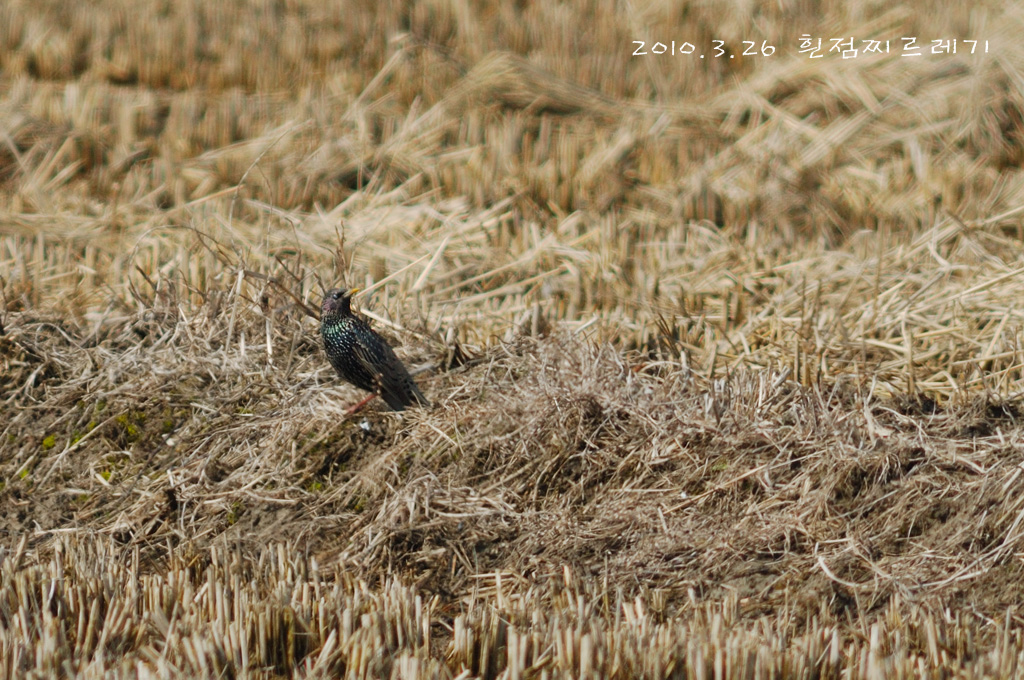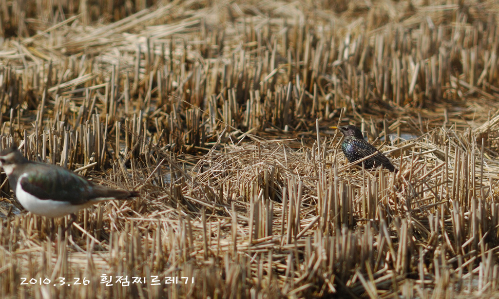 이상한 점은 찌르레기들과 어울리지 않고 댕기물떼새들과 함께 논바닥에서 먹이활동을 하네요...